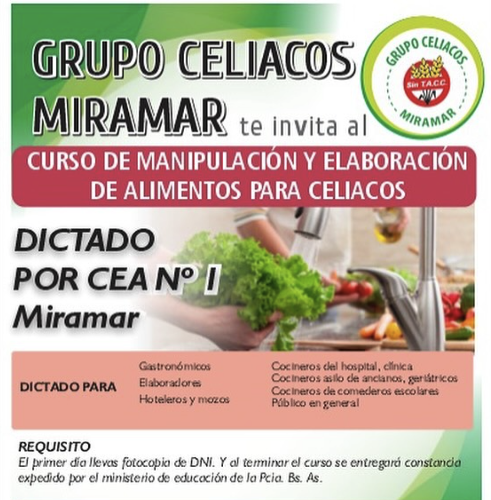 El Grupo Celíacos Miramar invita al Curso de Manipulación y Elaboración de Alimentos para Celíacos. Se trata del último curso del año a desarrollarse los días 4, 11 y 18 de noviembre.